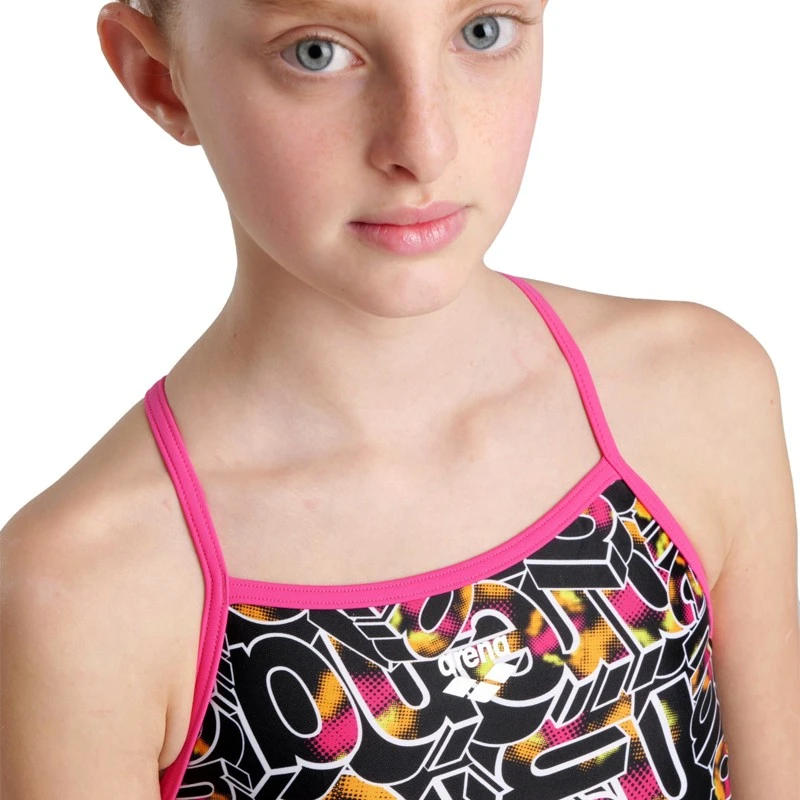 Our Allover Light Drop One-Piece for girls playfully experiments with our name and pop graphics to create a unique print.