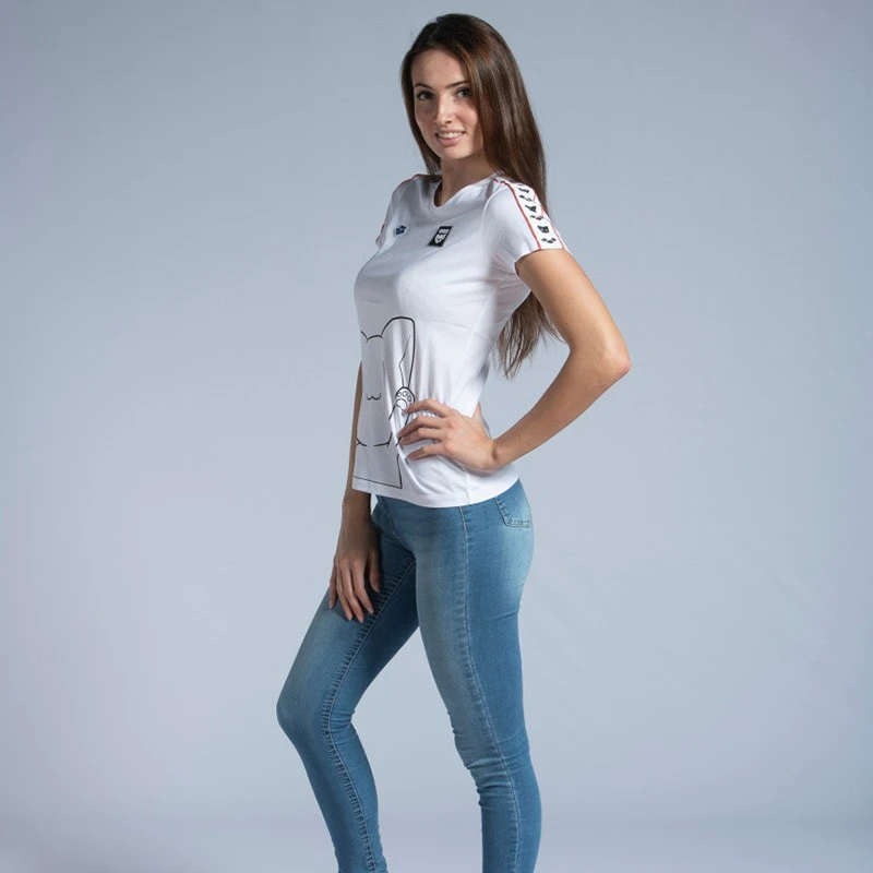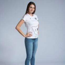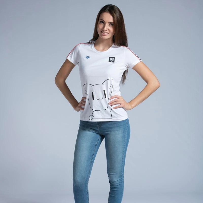 Our women’s Mizu Limited Edition Team T-shirt taps into the playful spirit of Japanese anime with a giant cartoon cat drawn by Electric Peo waving hello at the top’s hemline.